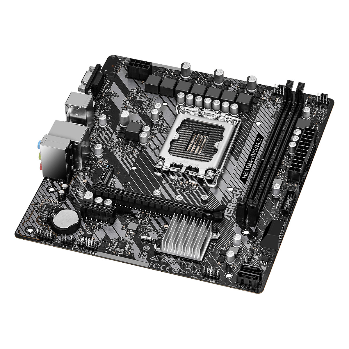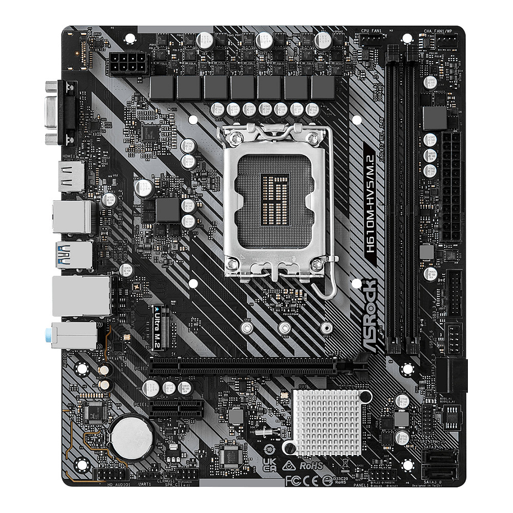Asrock H610M-HVS/M.2 R2.0. Processor manufacturer: Intel. Processor socket: LGA 1700. Compatible processor series: Intel® Core™ i3. Intel® Core™ i5. Intel® Core™ i7. Supported memory types: DDR4-SDRAM. Maximum internal memory: 64 GB. Memory slots type: DIMM. Supported storage drive interfaces: M.2. SATA III. Supported storage drive types: HDD & SSD. Maximum resolution: 4096 x 2160 pixels. Ethernet interface type: Gigabit Ethernet. LAN controller: Realtek RTL8111H