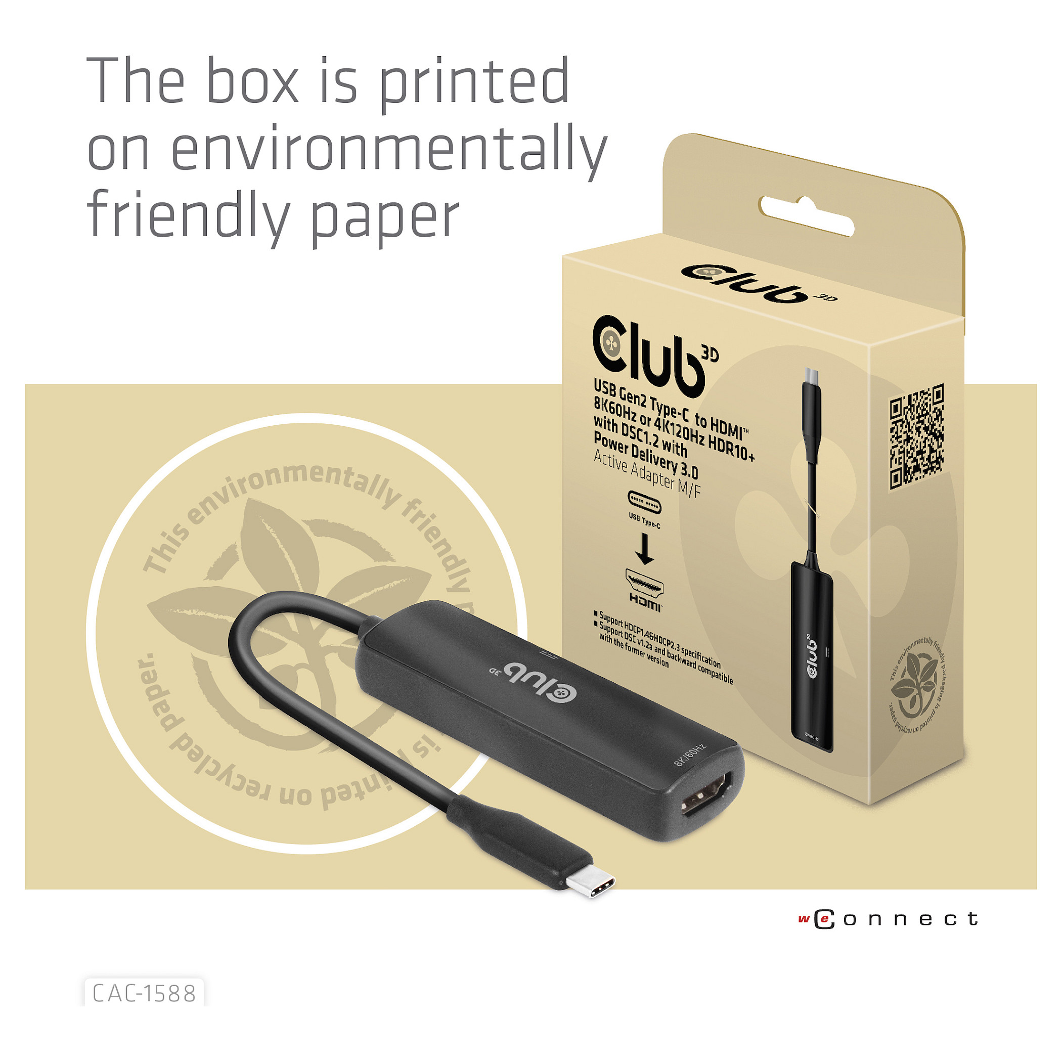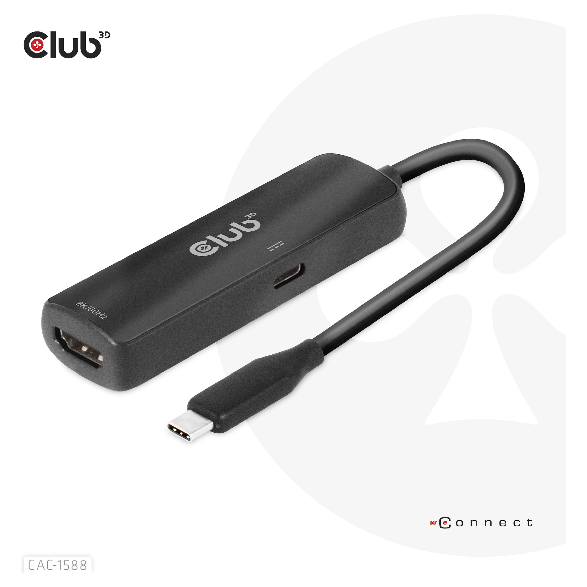 CLUB3D USB Gen2 Type-C to HDMI™ 8K60Hz or 4K120Hz HDR10+ with DSC1.2 with Power Delivery 3.0 Active Adapter M/F. Cable length: 0.17 m. Connector 1: USB Type-C. Connector 2: HDMI. Certification: Meets ROHS. FCC. and CE EMI requirements. Plastic packaging weight: 5 g. Paper/cardboard packaging weight: 22 g. Connector 1 dimensions (WxDxH): 29 x 12 x 7 mm. Weight: 40 g. Package width: 100 mm. Package depth: 100 mm. Package height: 35 mm