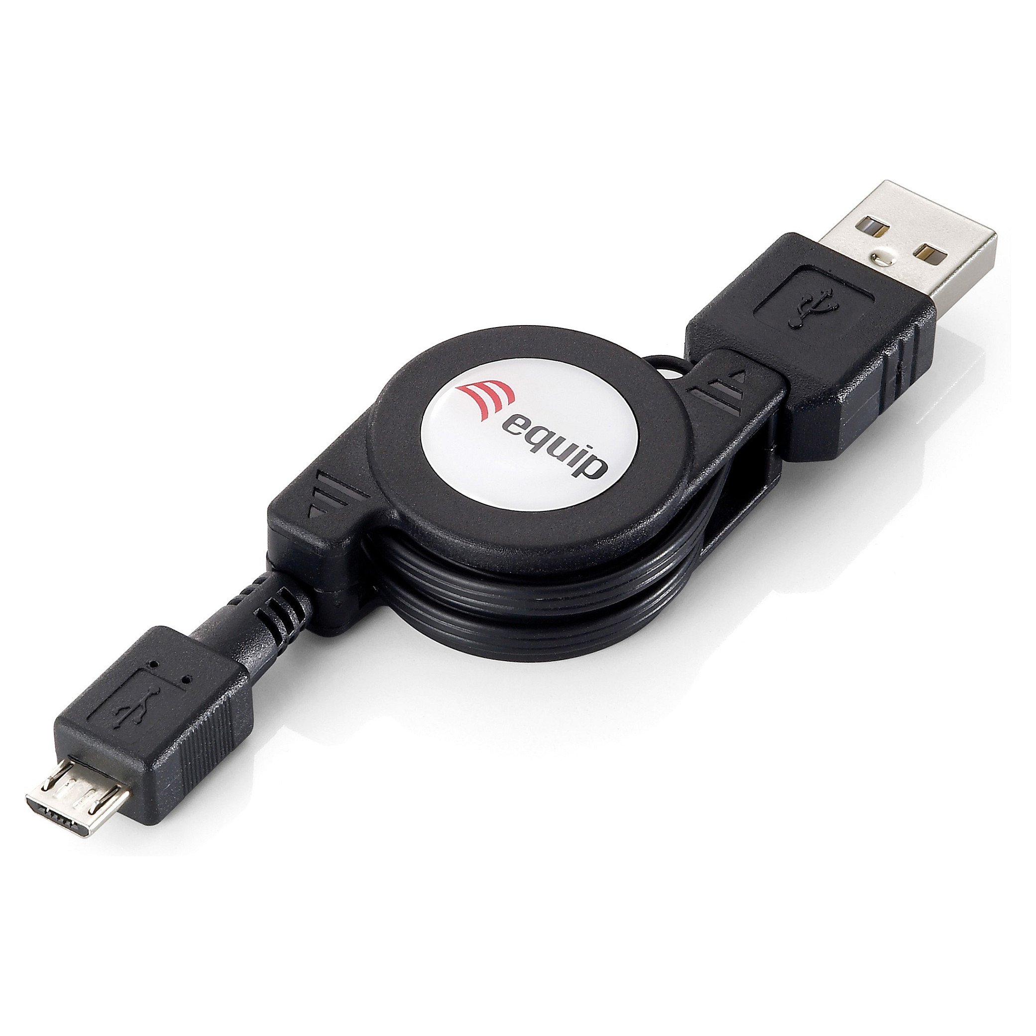 Equip USB 2.0 Type A to Micro-B Retractable Cable. 1.0m . Black. Cable length: 1 m. Connector 1: USB A. Connector 2: Micro-USB B. USB version: USB 2.0. Connector gender: Male/Male. Product colour: Black