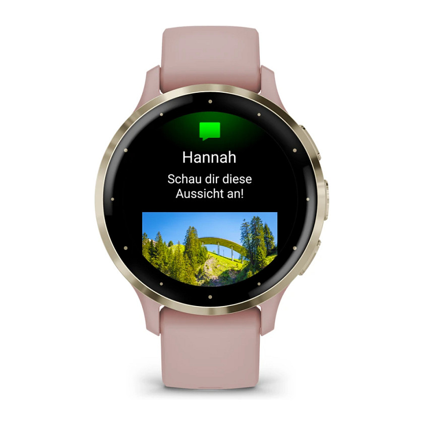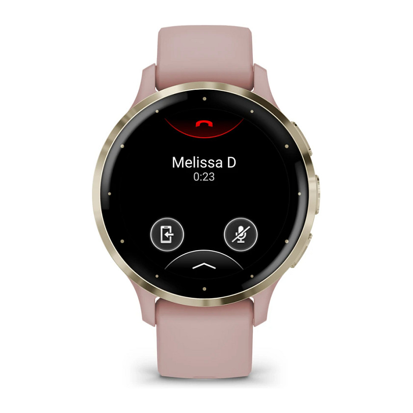 Garmin Venu 3S. Display diagonal: 3.05 cm (1.2″). Display technology: AMOLED. Display resolution: 390 x 390 pixels. Touchscreen. Flash memory: 8 GB. Wi-Fi. GPS (satellite). Weight: 40 g. Band material: Silicone. Band colour: Rose