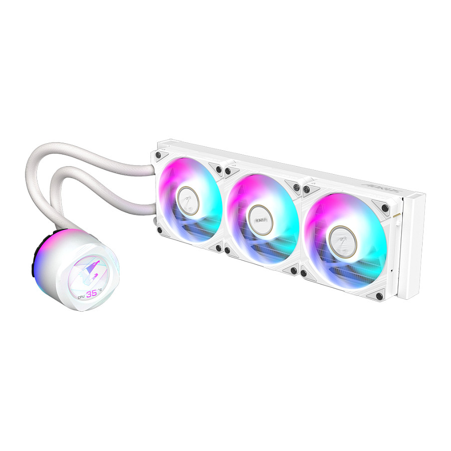 GIGABYTE AORUS WATERFORCE X II 360 ICE AIO Liquid CPU Cooler – 3x120mm ARGB Fans. full-color LCD. DAISY-CHAIN. Intel LGA 1851 and AMD AM5 Compatible. All-in-one liquid cooler. 12 cm. White