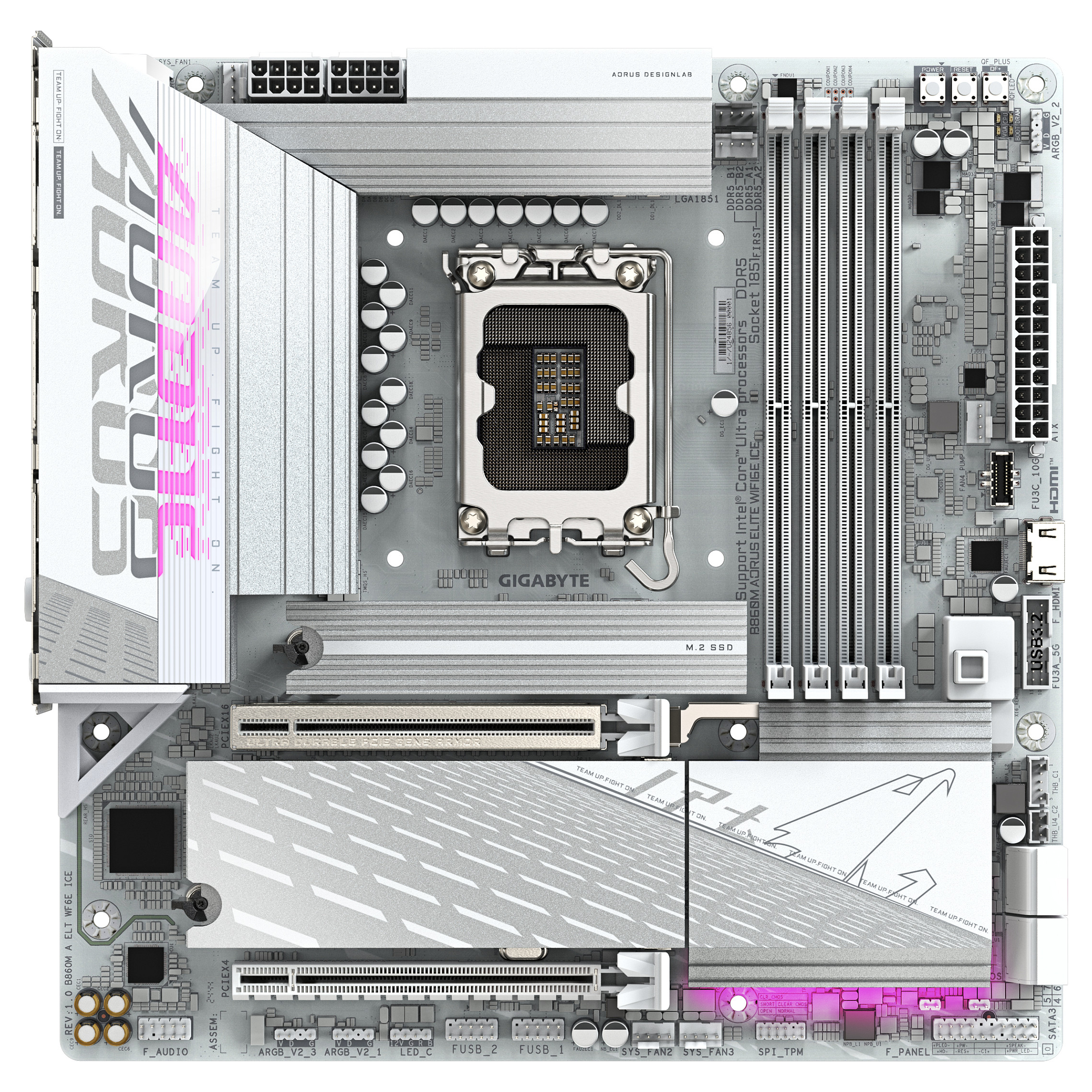 GIGABYTE B860M AORUS ELITE WF6E ICE Motherboard – Intel Core Ultra Series CPUs. 12+1+2+1 Phases VRM. up to 9200MHz DDR5. 1xPCIe 5.0 + 2xPCIe 4.0 M.2. 2.5GbE LAN. WIFI 6E. USB 4. Processor manufacturer: Intel. Processor socket: LGA 1851 (Socket V1). Compatible processor series: Intel® Core™ Ultra (Series 1). Intel Core Ultra (Series 2). Supported memory types: DDR5-SDRAM. Maximum internal memory: 256 GB. Memory slots type: DIMM. Supported storage drive interfaces: M.2. SATA III. Supported storage drive types: HDD & SSD. RAID levels: 0. 1. 5. 10. Maximum resolution: 4096 x 2160 pixels. Ethernet interface type: 2.5 Gigabit Ethernet. LAN controller: Realtek RTL8125. Top Wi-Fi standard: Wi-Fi 6E (802.11ax)