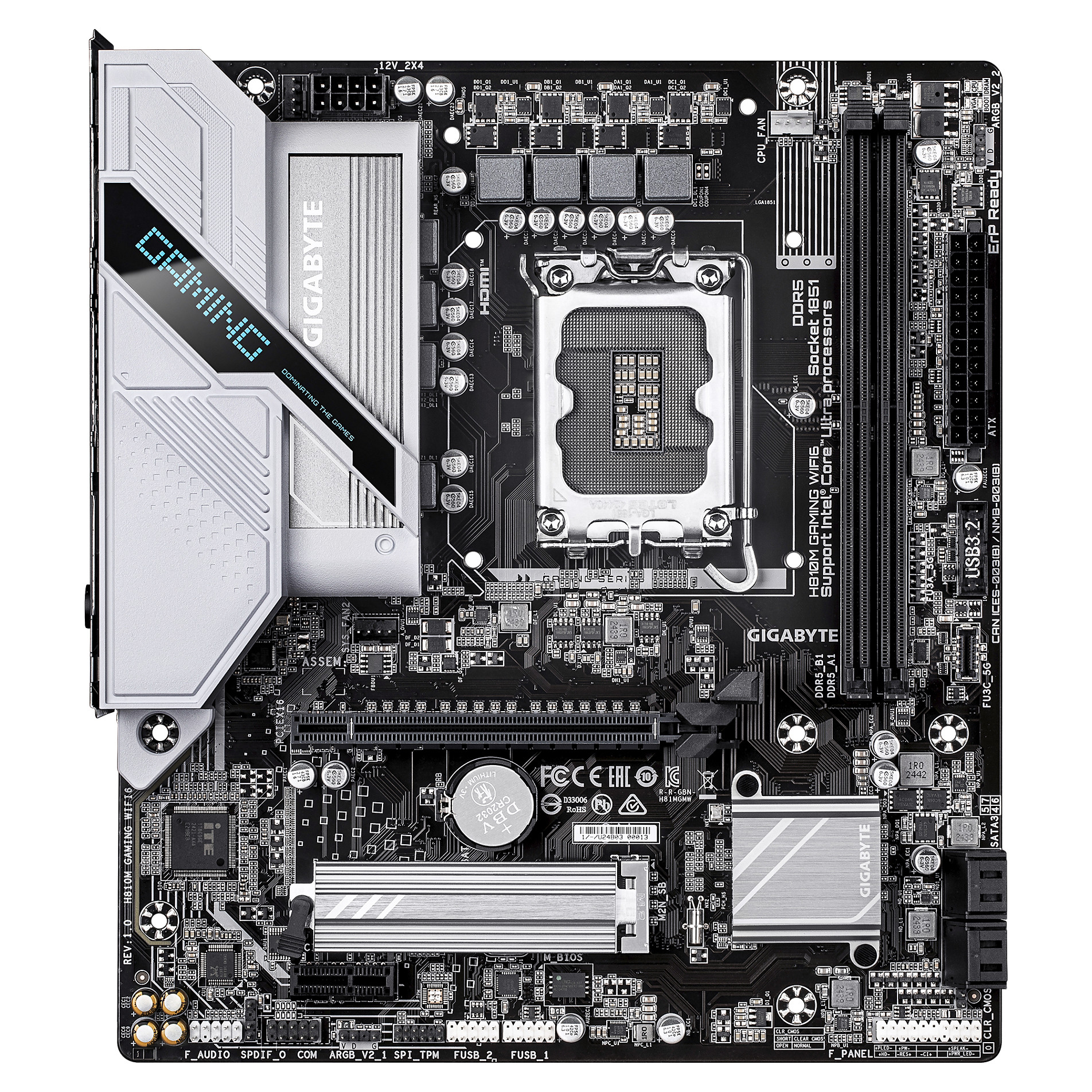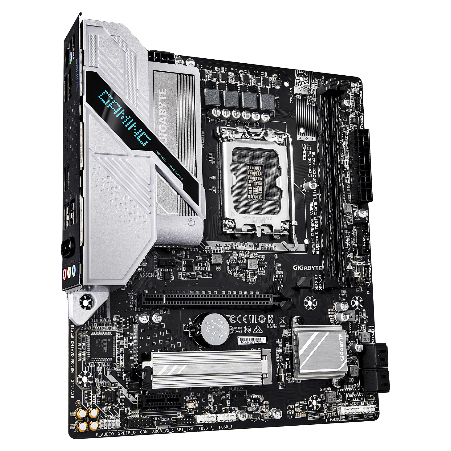 GIGABYTE H810M GAMING WIFI6 Motherboard – Intel Core Ultra (Series 2) CPUs. 4+1+2 Phases VRM. up to 6400MHz DDR5. 1xPCIe 4.0 M.2. 2.5GbE LAN. WIFI 6. USB 3.2 Gen 1. Processor manufacturer: Intel. Processor socket: LGA 1851 (Socket V1). Compatible processor series: Intel Core Ultra (Series 2). Supported memory types: DDR5-SDRAM. Maximum internal memory: 128 GB. Memory slots type: DIMM. Supported storage drive interfaces: M.2. PCI Express 4.0. SATA III. Supported storage drive types: HDD & SSD. RAID levels: 0. 1. 5. 10. Maximum resolution: 4096 x 2160 pixels. Ethernet interface type: 2.5 Gigabit Ethernet. LAN controller: Realtek RTL8125. Top Wi-Fi standard: Wi-Fi 6 (802.11ax)