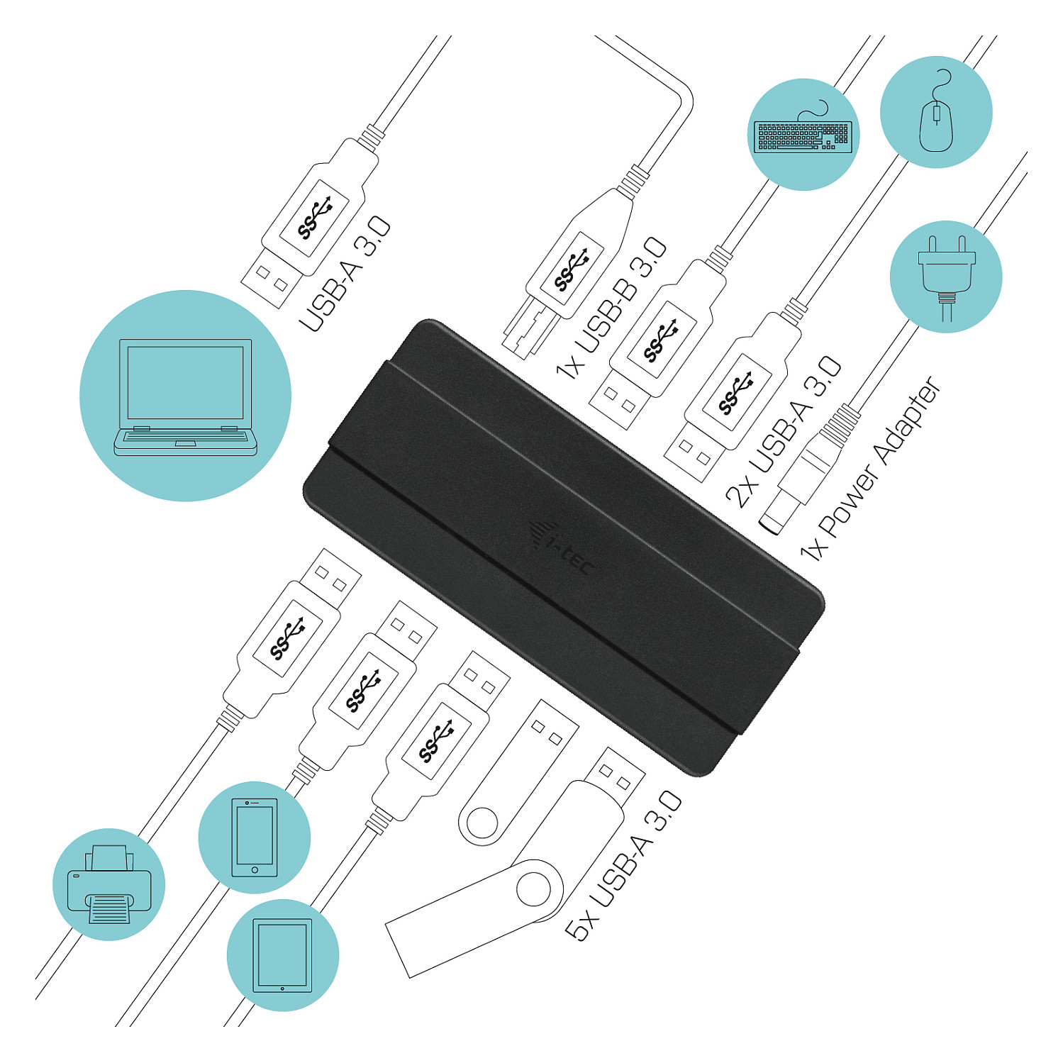 i-tec USB 3.0 Charging HUB 7 Port + Power Adapter. USB 3.2 Gen 1 (3.1 Gen 1) Type-B. USB 3.2 Gen 1 (3.1 Gen 1) Type-A. 5000 Mbit/s. Black. 0.9 m. AC