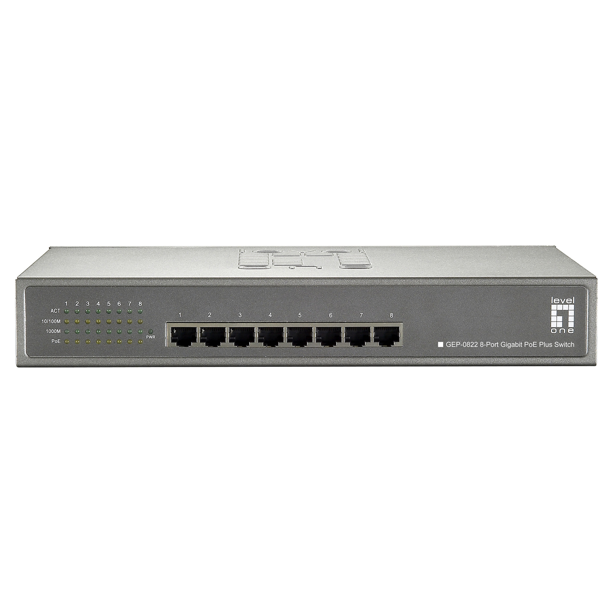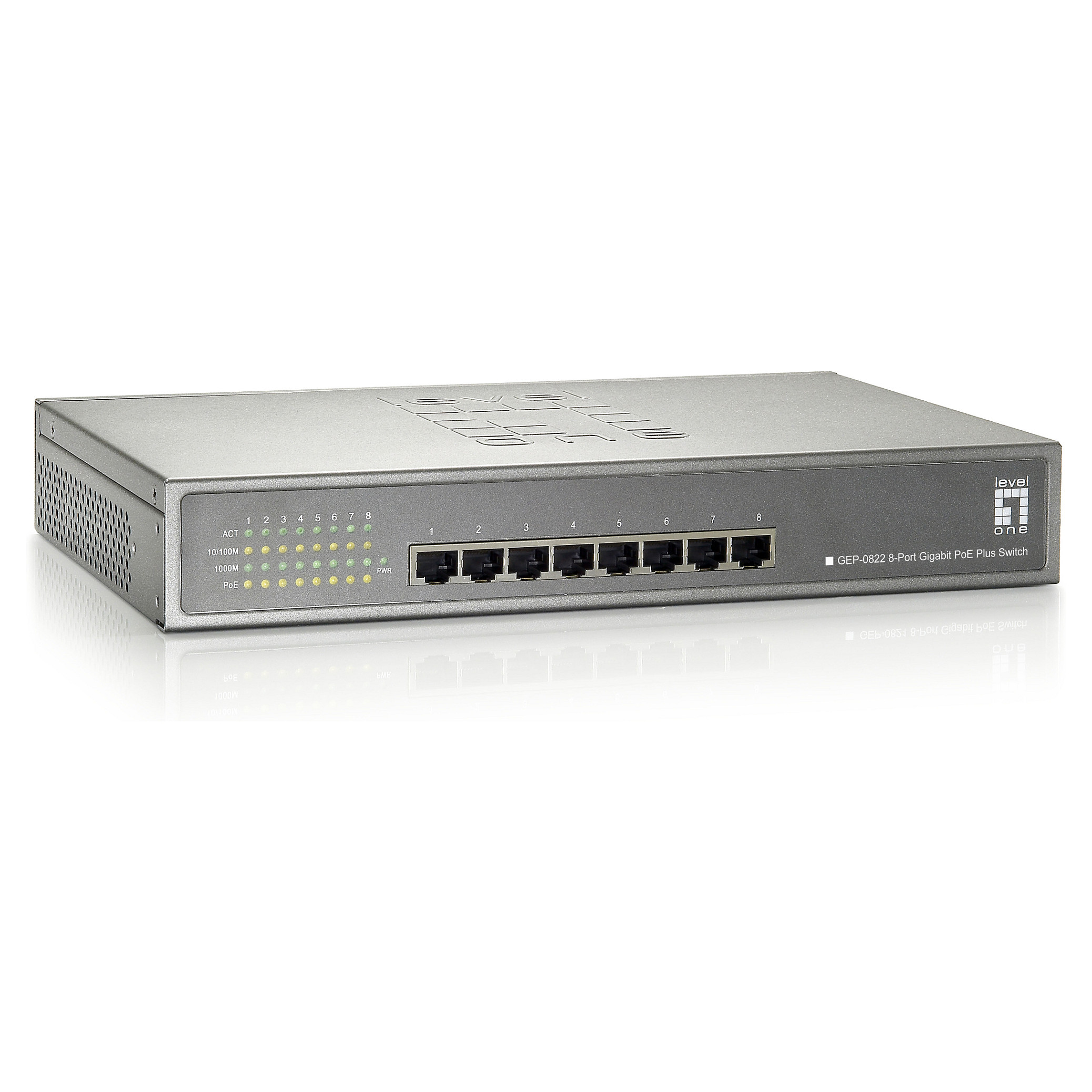 LevelOne 8-Port Gigabit PoE Switch. 802.3at/af PoE. 240W. Basic switching RJ-45 Ethernet ports type: Gigabit Ethernet (10/100/1000). Basic switching RJ-45 Ethernet ports quantity: 8. MAC address table: 8192 entries. Switching capacity: 16 Gbit/s. Networking standards: IEEE 802.3. IEEE 802.3ab. IEEE 802.3af. IEEE 802.3at. IEEE 802.3az. IEEE 802.3u. IEEE 802.3x. Power over Ethernet (PoE). Rack mounting