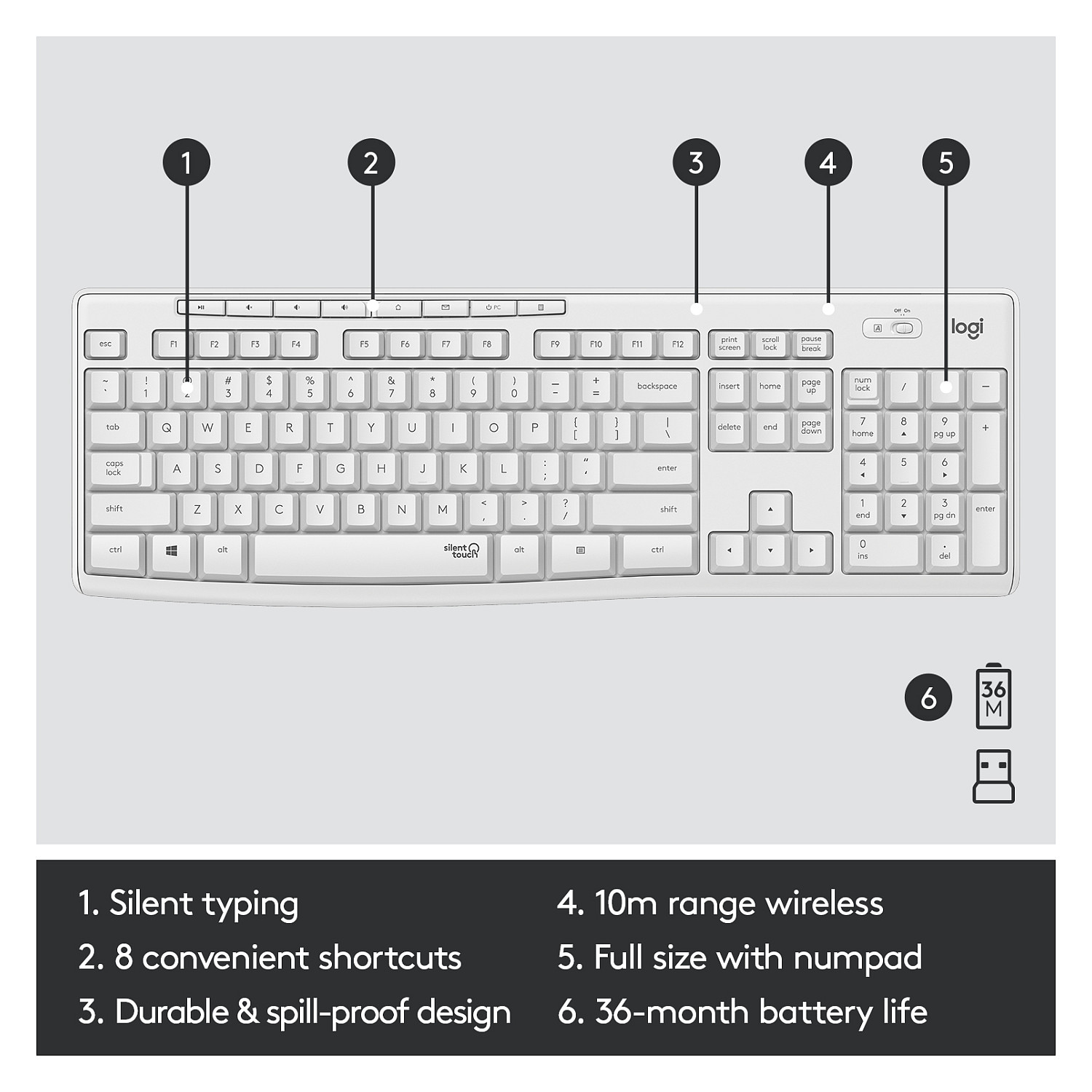 Logitech MK295 Silent Wireless Combo. Keyboard form factor: Full-size (100%). Keyboard style: Straight. Connectivity technology: Wireless. Device interface: RF Wireless. Keyboard layout: AZERTY. Recommended usage: Office. Product colour: White. Mouse included