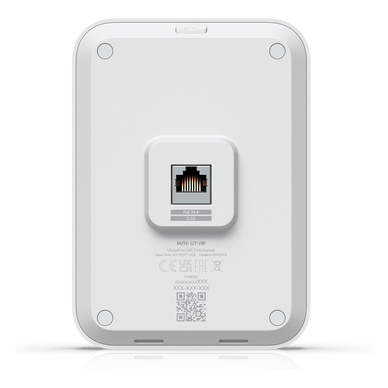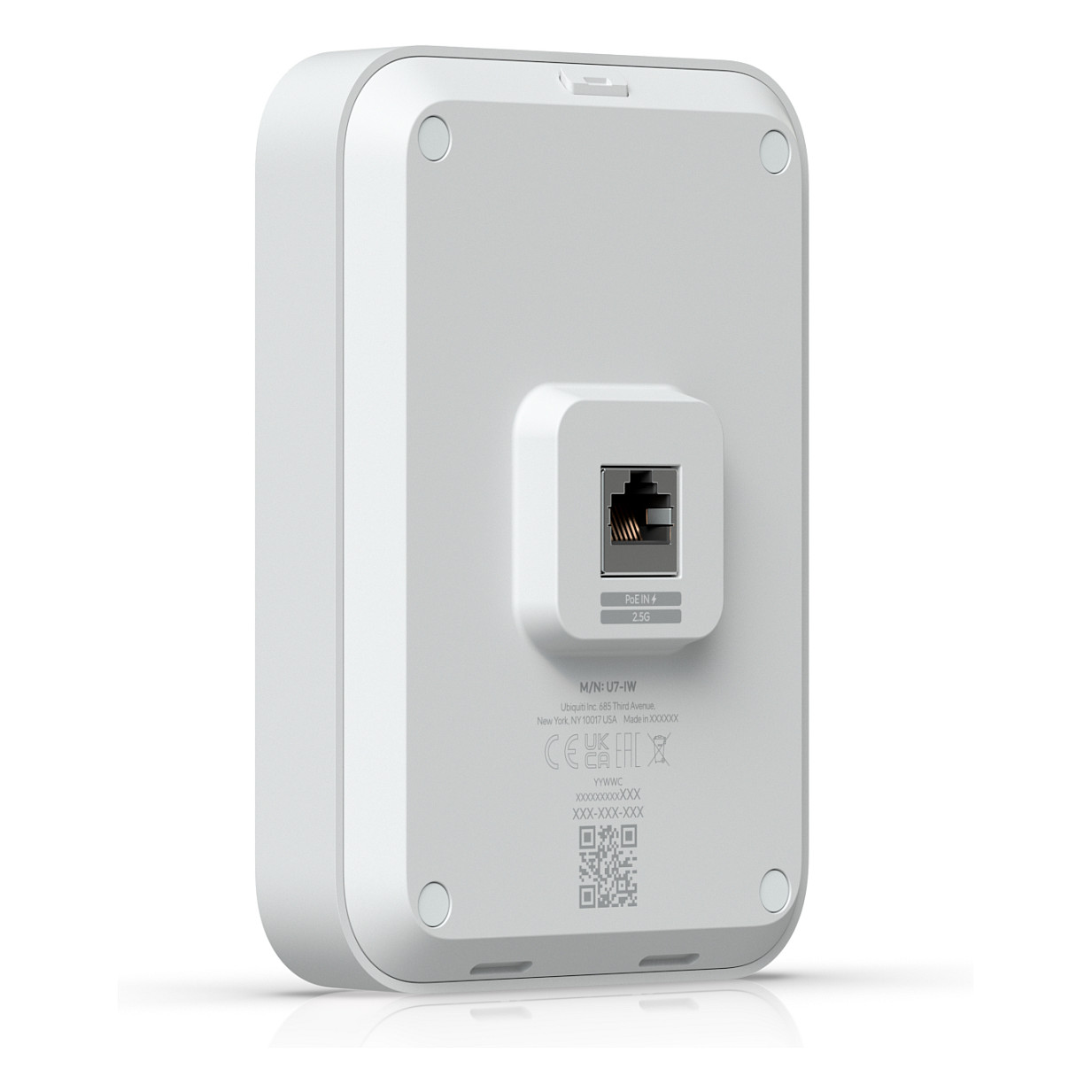 Ubiquiti U7 In-Wall. 2.4 GHz. 5 GHz. Maximum data transfer rate: 4300 Mbit/s. Security algorithms: PPSK. Ethernet LAN data rates: 2500 Mbit/s. Power over Ethernet (PoE). Product colour: White. Power consumption (max): 13 W